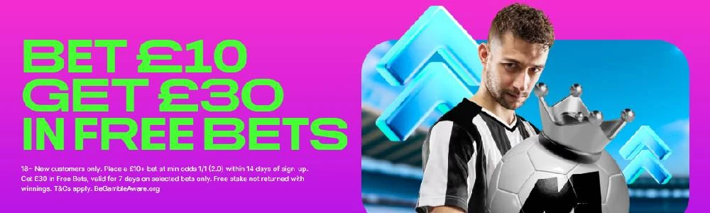 18+ New customers only. Place a £10+ bet at min odds 1/1 (2.0) within 14 days of sign-up. Get £30 in Free Bets, valid for 7 days on selected bets only. Free stake not returned with winnings.T&Cs apply. BeGambleAware.org