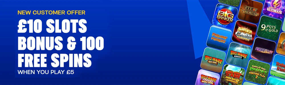 18+. New Casino players only. Deposit required (certain deposit types excluded). Bet £5+ on any Slot game for a £10 Bonus (selected games, 10x wagering, max stake £2, accept within 14 days, use within 30 days) & 100 Free Spins (selected games, 10p per spin, valid 7 days, accept within 48 hours). Restrictions & T&Cs apply.